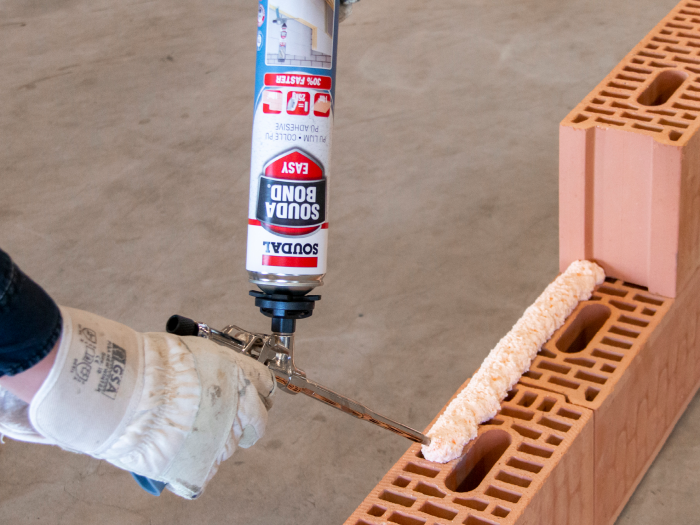 Συγκολλητικός αφρός πολυουρεθάνης της Soudal, ταχείας ωρίμανσης και έτοιμος προς χρήση, με υψηλή αντοχή συγκόλλησης και εξαιρετική ικανότητα πλήρωσης κενών σε μονωτικά και δομικά υλικά.
