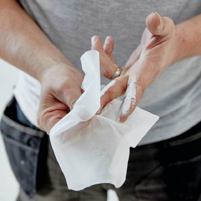 Μη υφασμένα μαντηλάκια της Soudal, εμποτισμένα με μείγμα βιοαποδομήσιμων διαλυτών για άμεσο καθαρισμό και μαλακτικά συστατικά για προστασία του δέρματος.