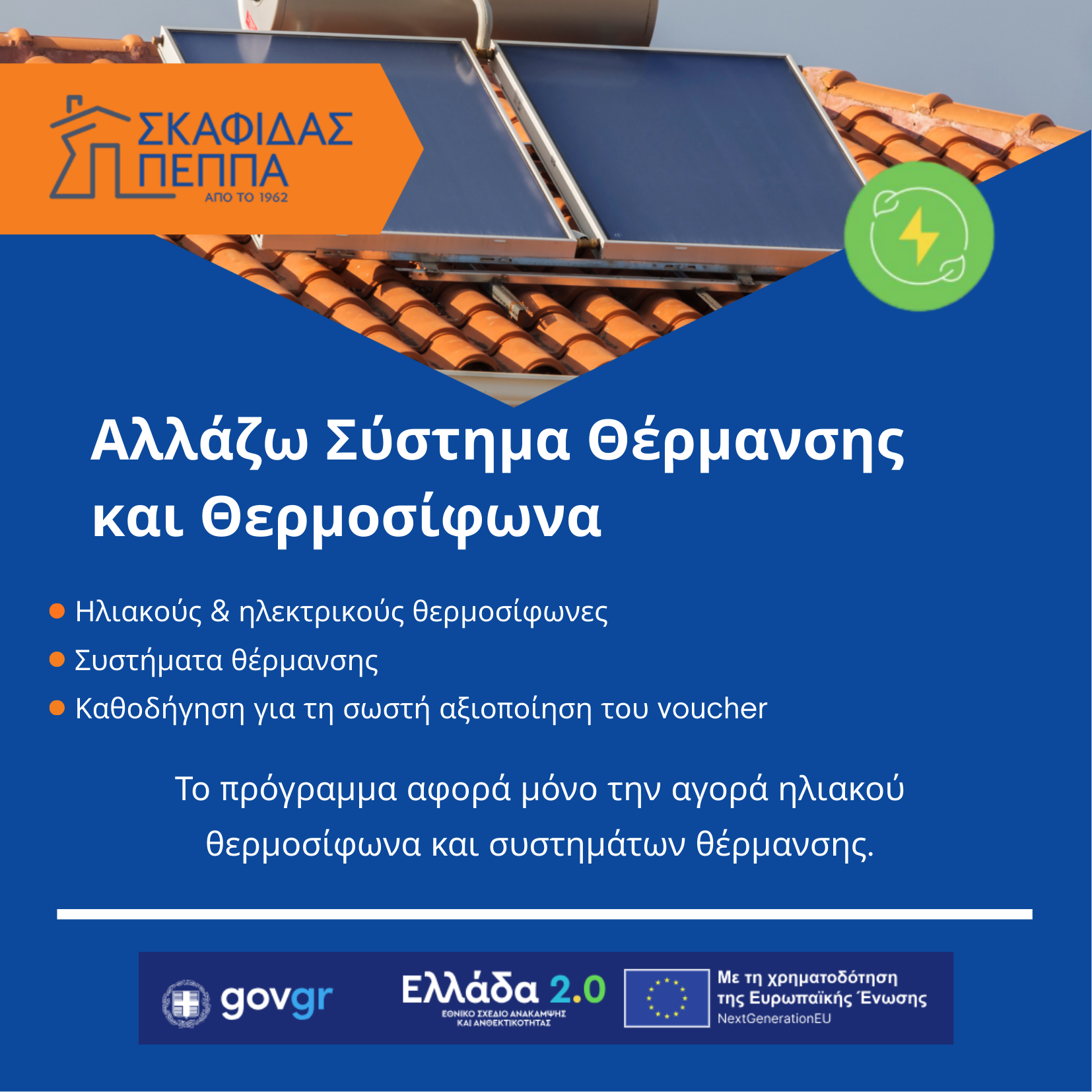 Η επιχείρησή μας είναι ενταγμένη ως εγκεκριμένος προμηθευτής στο πρόγραμμα «Αλλάζω Θερμοσίφωνα & Σύστημα Θέρμανσης».
